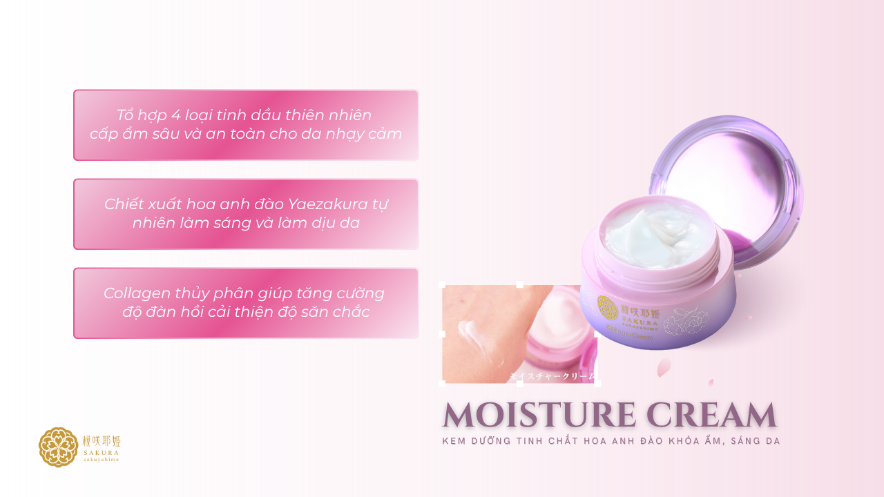 Không đơn thuần là chăm sóc da, đây là nghệ thuật phục hồi và nuôi dưỡng làn da từ bên trong, mang lại cảm giác thư thái, an yên trong từng lần sử dụng. Hãy cùng khám phá Moisture Cream bí mật đằng sau những giọt tinh dầu thuần khiết ấy – nơi mỗi thành phần không chỉ chăm sóc làn da, mà còn nâng niu vẻ đẹp tự nhiên theo cách rất riêng của Sakura Sakuyahime.